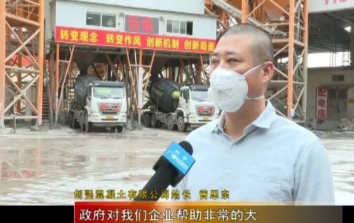 创强混凝土有限公司站长 曾思东说:“政府对我们企业帮助非常的大,帮我们解决了几千个口罩问题,消毒水给了十几二十桶,解决了我们企业购买难的问题,我们也想去买,但是买不了,政府帮我们解决了这些问题。”