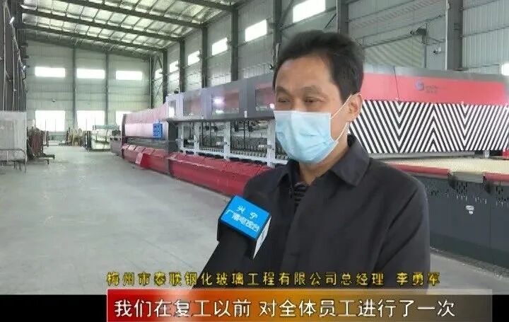 梅州市泰联钢化玻璃工程有限公司总经理 李勇军说:“我们在复工以前,对全体员工进行了一次活动轨迹摸排工作,都没问题,我们就通知他们准确的时间上班。上班的时候我们就在大门口,给他们发放口罩,测量体温,以及消毒。我们车间以及公共地方是一天消毒一次,卫生间就一天两次,都是严格按照政府的要求来做的。”