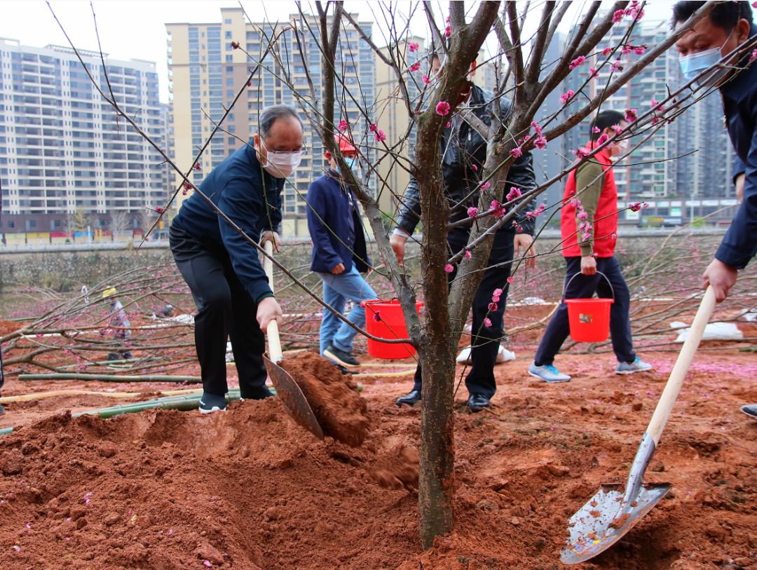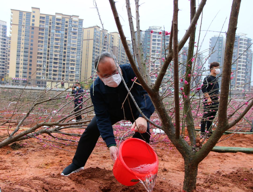 天更蓝、水更清、地更绿、生态更美好。何建元、罗利娜、何志平等市委、市人大常委会、市政府、市政协全体领导,市纪委监委、市法院、市检察院负责人以及部分党员志愿者等参加了活动。 在植树现场,余其豹、何建元、罗利娜、何志平等领导率先垂范,或三人一组、或五人一群,大家分工合作、相互配合,兴致勃勃地投入到义务植树活动中,他们挥锹铲土、扶正苗木、培实新土、提桶浇水,每一道工序都做得一丝不苟。经过约一个小时的努力,130多株梅花和樱花种植在亲水公园上,与宁江河交相辉映,为兴城增添一道亮丽的风景。 “树苗间距够不够?”“如何做好新苗管理”,余其豹一边与干部群众和志愿者们交流植树经验,一边向有关部门负责人了解今年我市植树造林等情况。 据了解,环球国际