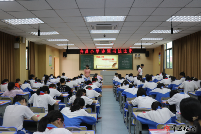齐昌小学举办诗词书法比赛。 学校利用功能场室齐全和师资力量的优势,充分调动各种教育教学资源,积极开展国学、阅读、国画、素描、龙鼓、舞蹈、足球、篮球、鼓号队等多元化社团活动,培养学生阳光心态、健康人格。同时积极加强队部室、心理咨询室建设,办好学校微信公众号、校园电视台、红领巾广播站、《星光》校报等自媒体宣传媒介,不断丰富“宣传栏”“学习园地”内容,以此提高孩子们的文明素养,净化校园育人氛围。在校园文化建设上,该校还从整体着眼,从局部起步,让校园的每一块墙壁都“说话”,让学生视线所到的地方,都带有教育性能,形成了“一廊一文化”的独特育人风景线。 图书馆、体育馆、钟楼、见贤楼、知行楼等楼宇场馆格外醒目,校训石、香樟树、秋枫、榆树等相映成趣。该校相关负责人表示,建设“绿色生态”学校是齐昌小学一直追求的教育理念,为此他们一直致力抓好校园绿化、美化、净化工作,将创造良好的校园环境和育人文化有机地结合起来,校园整体设计突出自己的特色,实现了思想观念、布局格调、育人功能的和谐统一。除了“外在美”,该校还积极实施强师战略,通过开展课堂教学评比、说课比赛等活动,以赛促教,教研相长,致力培养造就一支有人文情怀、有健全人格、有责任担当的教师队伍。