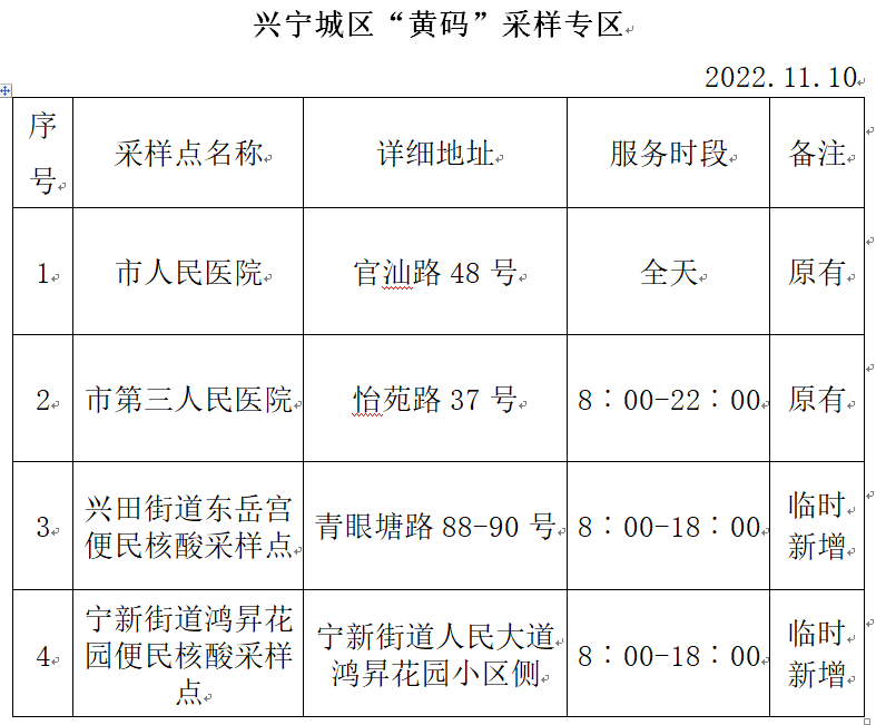 1.原兴田街道东岳宫便民核酸采样点、宁新街道鸿昇花园便民核酸采样点,均调整为“黄码”采样专区。