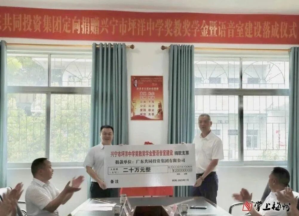 坪洋中学奖教奖学金暨语音室建设落成仪式。 活动中,坪洋中学接受了广东共同投资集团的捐赠支票,大坪镇党委政府、坪洋中学分别向广东共同投资集团赠送了牌匾,与会领导和嘉宾共同为坪洋中学语音室建设落成揭牌。 据介绍,广东共同投资集团已经连续两年为大坪镇教育事业无私捐款,同时计划投资一亿元在大坪镇打造红色旅游小镇田园综合体,助力乡村振兴。此次共捐赠20万元,专门用于坪洋中学的奖教奖学和语音室建设,为坪洋中学的教育办学注入新的动力。 来源:掌上梅州