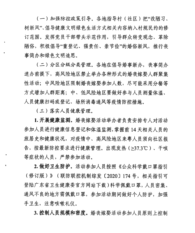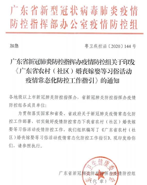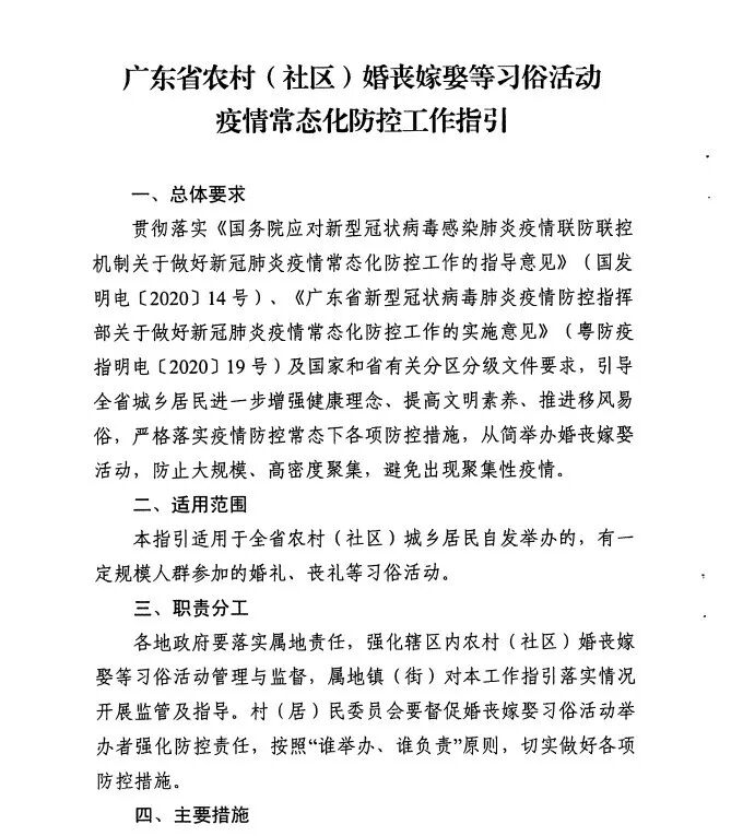 为贯彻落实国家和省委、省政府关于新冠肺炎疫情常态化防控工作部署,切实做好疫情防控常态下我省农村(社区)婚丧嫁娶等习俗活动疫情防控工作,省新冠肺炎防控指挥办疫情防控组组织编制了《广东省农村(社区)》婚丧嫁娶等习俗活动疫情常态化防控工作指引》的通知。全文如下 :