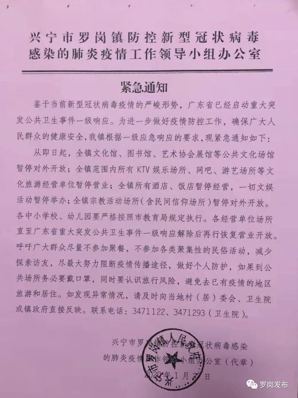 1月27日上午。罗岗镇召开防控新型冠状病毒感染的肺炎疫情工作会议,对我镇防控工作进行再强调、再部署、再安排。 会上,镇党委主要负责人强调:一是全体镇村干部继续做好摸查工作,及时报送从湖北返(抵)兴人员相关信息;二是落实24小时值班制度,积极做好湖北返乡人员跟踪监测工作,加强宣传和劝导;三是做好对人员易聚集场所暂停营业管理工作,对酒店、餐馆、KTV等场所进行宣传引导;四是做好不组织、不举办、不参加宴请、聚餐、舞龙、赏灯、婚丧喜庆事宜等各类群众性聚集民俗活动劝导活动。 1月27日晚,我镇组织工作人员开展人员易聚集场所暂停营业管理工作,发放《紧急通知》并做好入户宣传工作。 制定湖北返兴人员24小时值守安排表,做好“一户一档”登记并发放慰问物资。 下来我镇将继续做好防控好工作不放松,也请广大父老乡亲配合我们的工作,尽量不参加聚餐,不参加各类聚集性的民俗活动,减少探亲访友,尽最大努力阻断疫情传播途径,做好个人防护,如果到公共场所务必要戴口罩。让我们携手,共同打赢新型冠状病毒感染的肺炎疫情防控战。