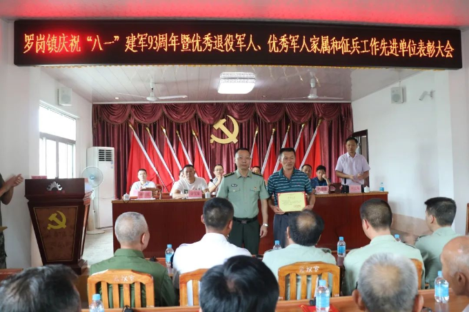 会上,罗岗镇党委委员、武装部长钟宇兵宣读《关于“八一”表彰罗岗镇优秀退役军人、优秀军人家属和征兵工作先进单位的决定》,并由镇领导班子为优秀退役军人、优秀军人家属和征兵先进单位颁发荣誉证书。