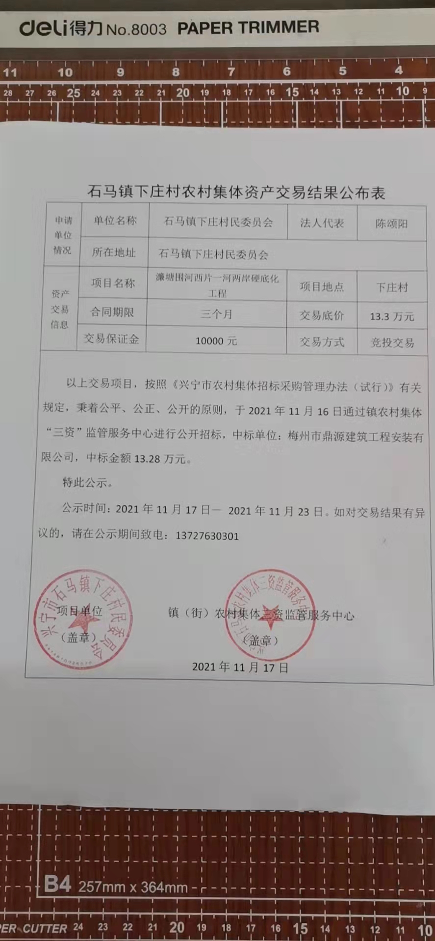 石马镇下庄村农村集体资产交易公示