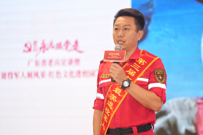 宣讲会上,五位优秀退役军人代表用真挚的情感和生动的语言,分享了他们奋斗新征程的动人故事。第三届“广东最美退役军人”孙宏宁以《誓言·价值》为题,深情讲述了2001年南海撞机事件中战友王伟英勇牺牲的感人事迹,以及自己身患肌肉萎缩症仍坚持投身公益救援的动人故事;全国退役军人工作模范个人徐云峰以《我是“红色守碑人”》为题,分享了自己从三军仪仗队礼兵到守护烈士陵园的心路历程;广州市最美退役军人王新元讲述了自己从侦察兵到广绣传承人的成功转型;清远市最美退役军人庞水旺回顾了从维和战士到驻村第一书记的奋斗历程;肇庆市最美退役军人刘爽则分享了从大学生士兵到基层公务员的成长故事。