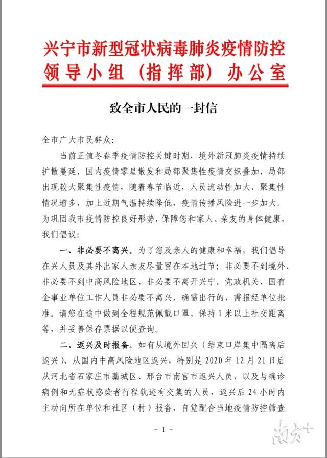今日,环球国际官网 新冠肺炎防控指挥办发布《致全市人民的一封信》,倡议非必要不离兴,返兴及时报备。