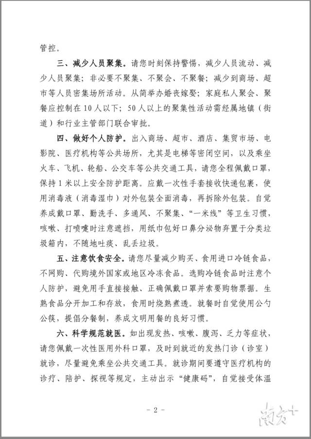 同时,信中倡议,减少人员聚集。时刻保持警惕,减少人员流动、减少人员聚集;非必要不聚集、不聚会、不聚餐;减少到商场、超市等人员密集场所活动。从简举办婚丧嫁娶;家庭私人聚会、聚餐应控制在10人以下;50人以上的聚集性活动需经属地镇(街道)和行业主管部门联合审批。