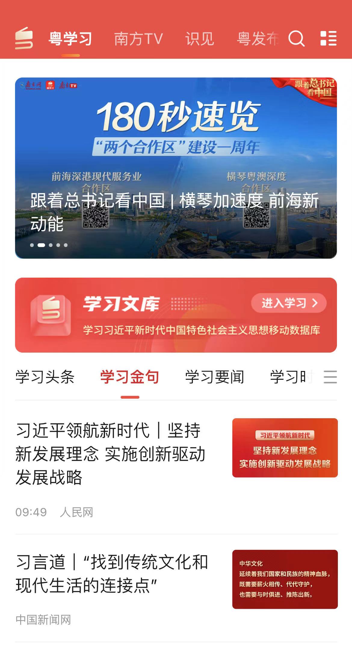 据了解,“粤学习”APP上线以来,重点打造“学习头条”“学习金句”“学习要闻”“学习时评”“广东践行”“美好生活”六大核心栏目,同步推出“南方TV”“粤政”“识见”“识趣”“新闻”“政直播”等六个特色版块。