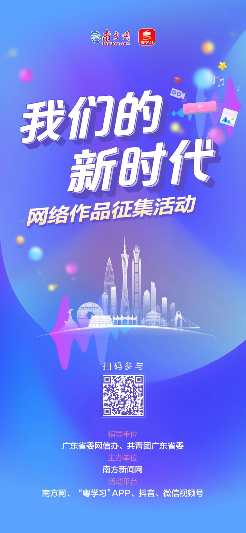 近日,由广东省委网信办、共青团广东省委指导,南方新闻网主办的“我们的新时代”网络作品征集活动正式启动,在南方网、“粤学习”APP、抖音、微信视频号同步上线。即日起至10月9日,诚邀广大网民围绕广东美好生活、奋斗故事、粤港澳大湾区建设、大美广东、青少年健康成长等主题,面向全网征集音视频、图片、文字三类作品,反映广东经济社会发展给人民带来的获得感、幸福感、安全感。优秀作品将集中在“粤学习”APP等网络平台同步展播,并参与投票评奖。(记者/李润芳 张菲菲)