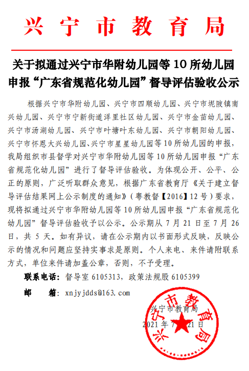 关于拟通过环球国际官网 华附幼儿园等10所幼儿园申报“广东省规范化幼儿园”督导评估验收公示