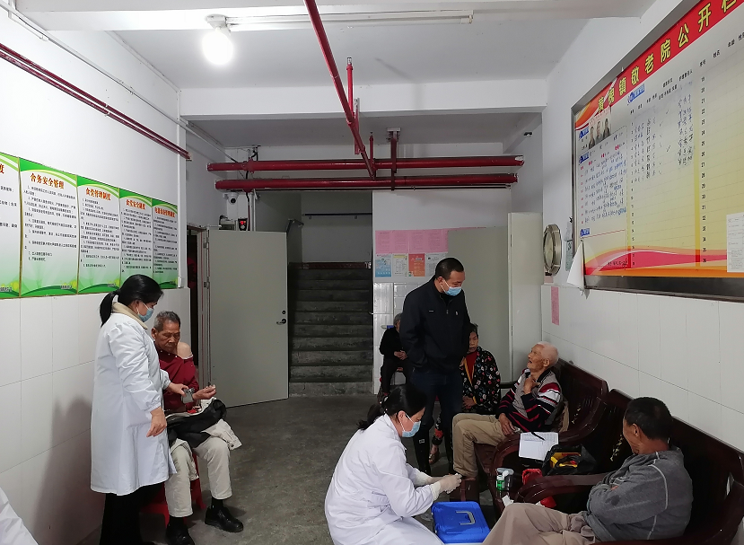 上门为养老院的老年朋友现场测量血糖、血压和接种疫苗