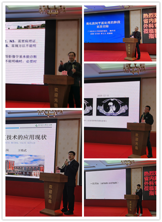 广州医科大学附属肿瘤医院胸外科主任赵健、广州医科大学附属肿瘤医院胸外科伍传新,南方医科大学珠江医院胸外科教授李辉,南方医科大学珠江医院心胸外科主任王晓斌,南方医科大学南方医院心外科呼宇分别讲授了《胸部肿瘤的免疫治疗进展》《简化段间平面处理的肺段亚段切除》《食管癌免疫治疗的病例汇报》《风湿性二尖瓣修复技术的应用现状》《功能性二尖瓣返流的思考》《病案讨论》,从内科、外科、肿瘤等学科的不同角度对癌症的免疫治疗和心脏瓣膜病例等最新进展作了专题授课,引发了与会人员的广泛回应和热烈讨论,会议氛围浓厚。
