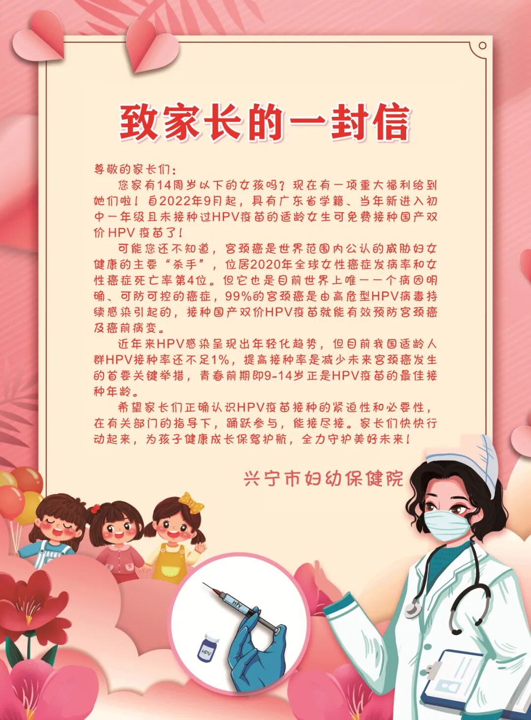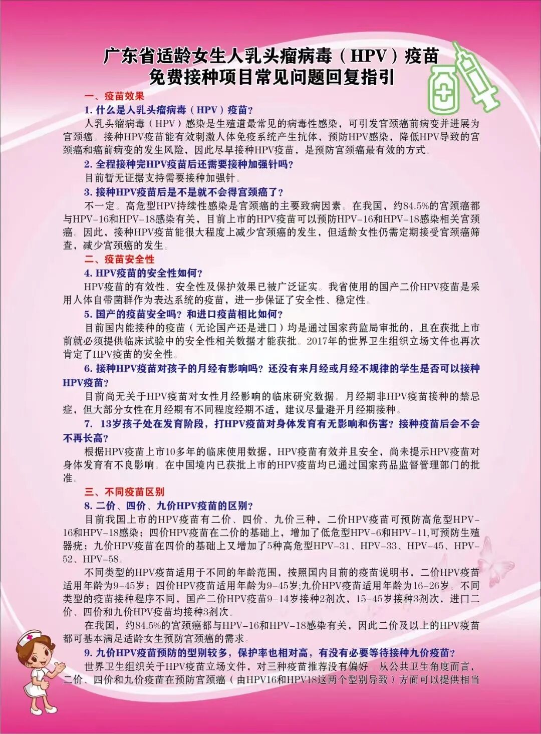根据梅州市统一部署和《环球国际官网 适龄女生人乳头瘤病毒(HPV)疫苗免费接种工作方案(2022-2024年)》文件要求,我市将于9月17日集中开展(HPV)疫苗第1剂次接种工作。