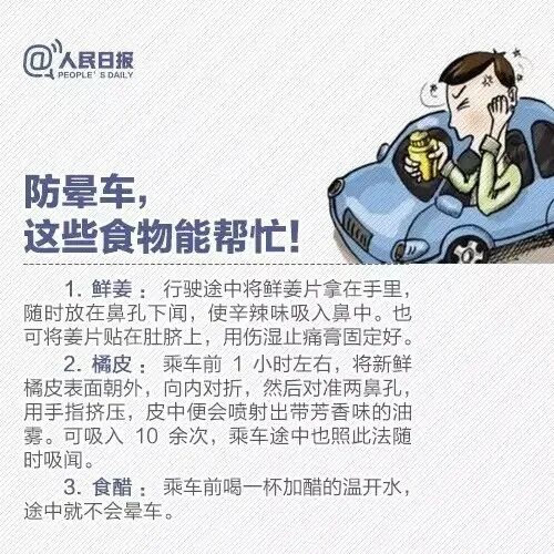 晕车的朋友出行前记得带上几个橘子。乘车前1小时,将新鲜橘皮表面朝外,向内对折,然后对准两鼻孔用手指挤压,皮中便会喷射出带芳香味的油雾。
