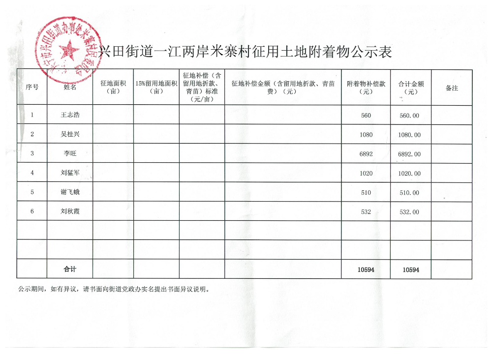 兴田街道一江两岸米寨村征用土地附着物公示表